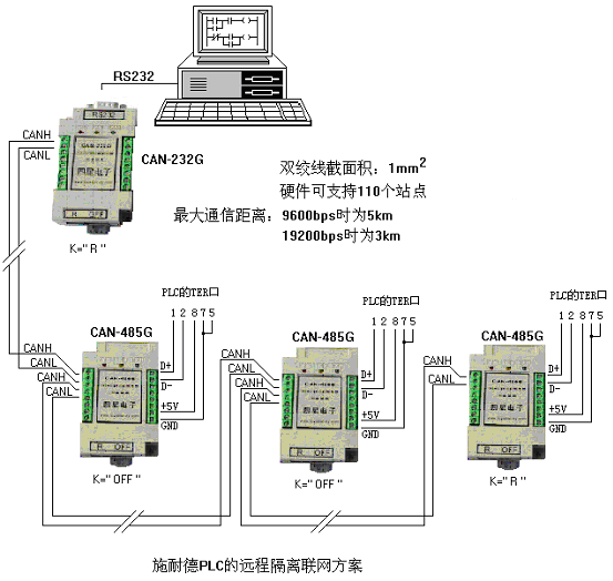 通過在每臺PLC的通信口安裝CAN-485G遠(yuǎn)程驅(qū)動器,如下圖所示,波特率為9600bps時可實現(xiàn)最大通信距離為5公里,19200bps時可達(dá)3公里,這可能是目前無中繼器時銅線傳輸?shù)淖畲缶嚯x,CAN-485G是隔離的透明傳輸驅(qū)動器,該產(chǎn)品并未使用CAN協(xié)議而采用了透明傳輸方式,因此使用CAN-485G后并不需對原有軟件作任何修改!CAN信號與RS485信號相比有諸多優(yōu)點(diǎn),讀者可參看網(wǎng)站的相關(guān)文章。