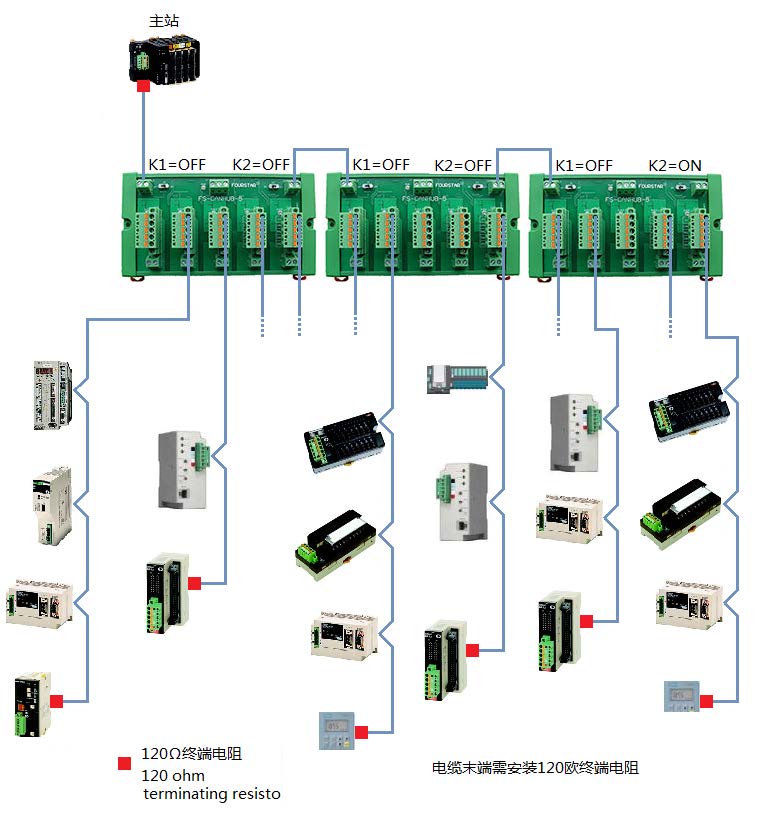 這種方案可以多出一個CAN口。擴(kuò)展總線CANH0、CANL0通常就近接主站設(shè)備,這個主站設(shè)備的CAN口需接一只120歐終端電阻,最后一臺FS-CANHUB-5右邊的開關(guān)撥到ON,除此之外的所有開關(guān)撥到OFF。如下圖所示,注意圖中開關(guān)的設(shè)置。