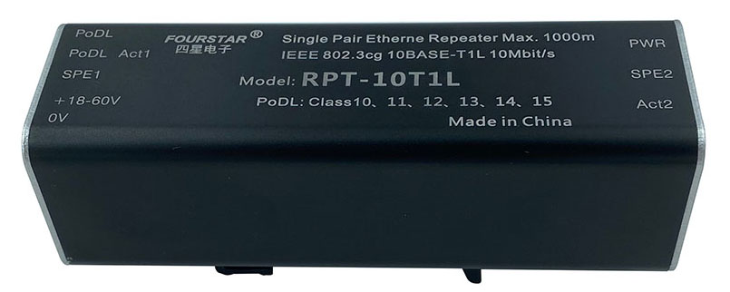 2、在現(xiàn)場終端受電設(shè)備前安裝一個四星電子的SPE中繼器RPT-10T1L,終端受電設(shè)備的電力由中繼器的工作電源供給,這樣就可全部使用細纜節(jié)省費用,這時SPE交換機的PoDL供電可以關(guān)閉,不同功率等級下的最大電纜長度都可達到1000米,因為此時SPE交換機到SPE中繼器之間只傳輸數(shù)據(jù),如下圖所示: