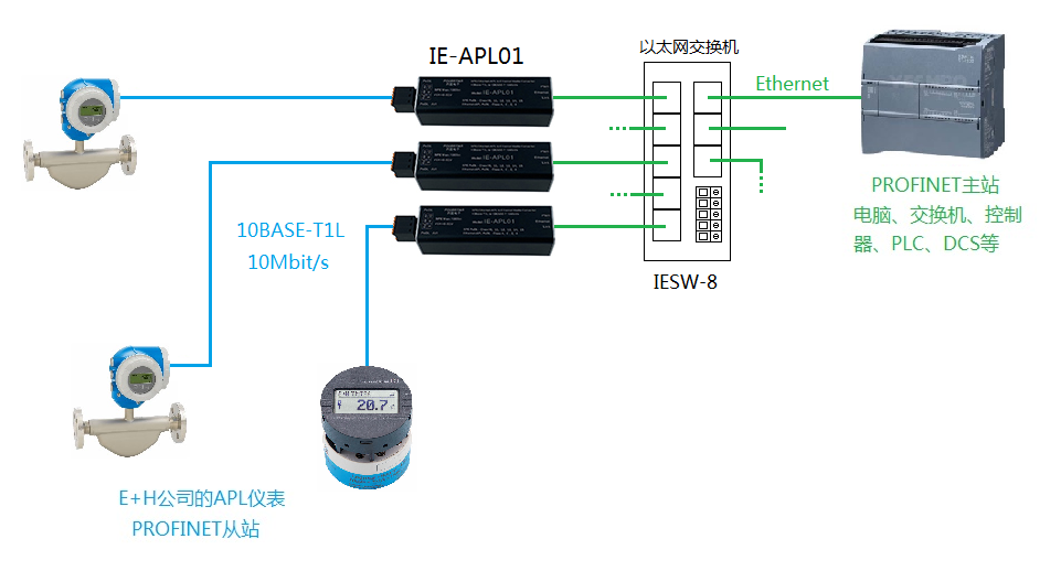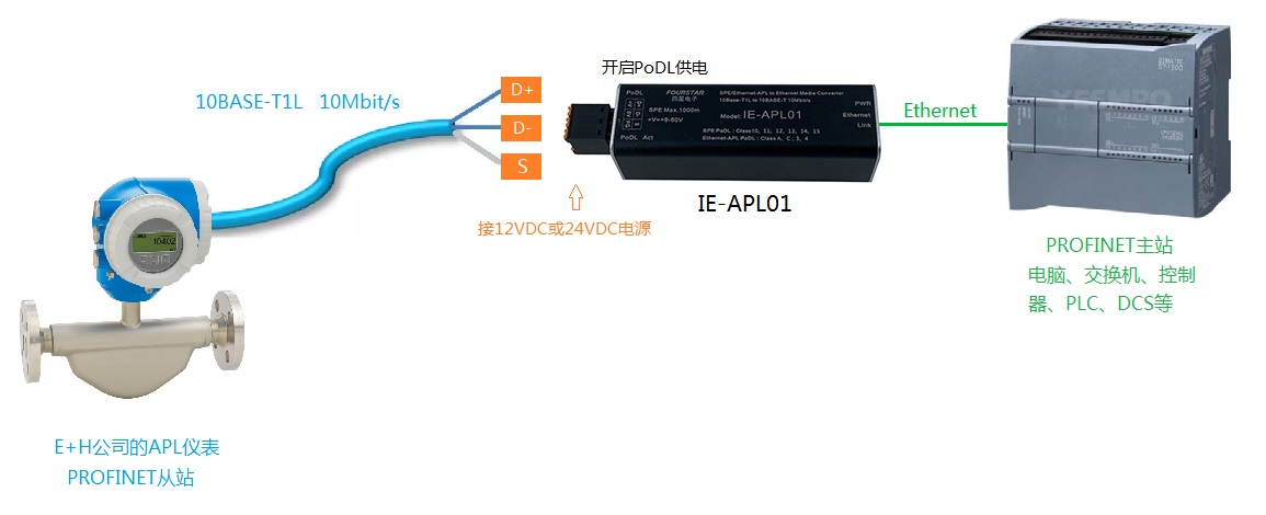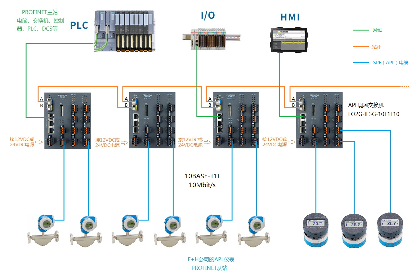 下面是E+H公司的APL儀表采用四星電子APL介質(zhì)轉(zhuǎn)換器和APL現(xiàn)場(chǎng)交換機(jī),連接上位PROFINET主站控制器(PLC、DCS等)的各種連接拓?fù)洌鶕?jù)APL儀表要求的數(shù)據(jù)線供電電壓來(lái)決定四星電子APL介質(zhì)轉(zhuǎn)換器和APL現(xiàn)場(chǎng)交換機(jī)的工作電源電壓采用12VDC或是24VDC。