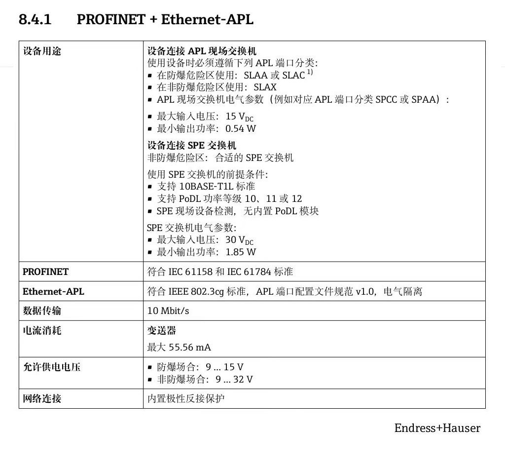 現(xiàn)在越來(lái)越多的儀表采用了Ethernet-APL技術(shù),用一對(duì)雙絞線同時(shí)實(shí)現(xiàn)以太網(wǎng)數(shù)據(jù)通信和電力傳輸,典型的如E+H公司的E300流量計(jì)、TMT86溫度變送器……等,這些儀表的特點(diǎn)是采用Ethernet-APL或單對(duì)以太網(wǎng)(SPE)接口+數(shù)據(jù)線供電(PoDL)技術(shù),通信協(xié)議為PROFINET,其相關(guān)技術(shù)參數(shù)如下圖所示: