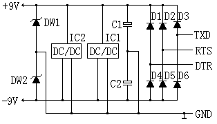 本裝置不需外接電源,其工作電源從RS232接口上竊取。如圖4所示:圖中TXD、RTS、DTR是RS232的輸出信號,每根信號線可提供約9mA的輸出電源,通訊時(shí)其電壓在+10V和-10V之間跳變,通訊停止后其電壓極性不定,但開機(jī)上電時(shí)全部為-10V。該三個(gè)信號經(jīng)D1~D6全波整流和C1、C2濾波后得到+9V和-9V直流電壓,若是開機(jī)上電狀態(tài)則只有-9V電壓。IC1和IC2分別是負(fù)電壓到正電壓轉(zhuǎn)換器和正電壓到負(fù)電壓轉(zhuǎn)換器,將輸入電壓轉(zhuǎn)換極性并升壓,這樣無論TXD、RTS、DTR是什么極性都能在DW1和DW2端得到+9V和-9V的穩(wěn)定電壓。亦即不需靠軟件設(shè)置來得到工作電壓,確保適合所有軟件!其實(shí)只需以上任意一根信號線即可滿足要求。